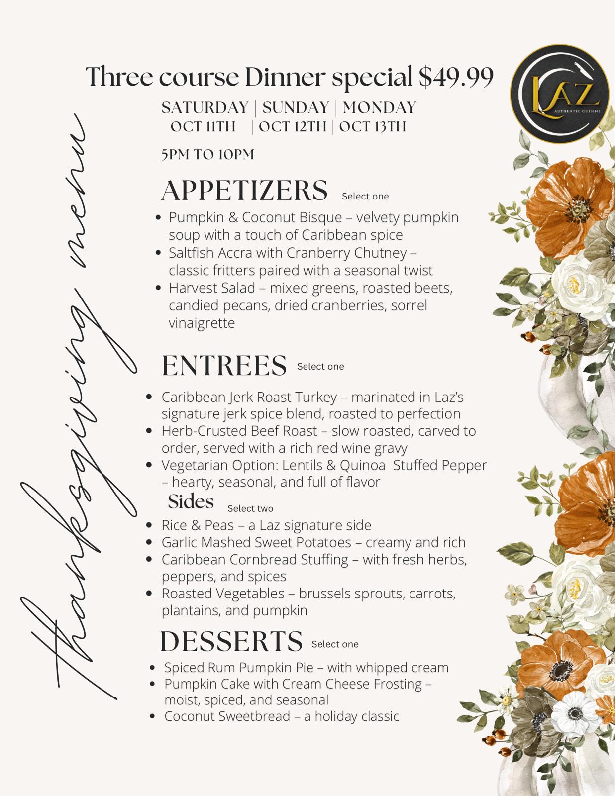 Celebrate Thanksgiving weekend at Laz Authentic Cuisine with a special three-course dinner crafted to blend warmth, flavor, and Caribbean flair. Join us for an unforgettable dining experience filled with festive ambiance and exceptional hospitality. Available October 11th–13th from 5 PM to 10 PM. Make your reservation today.